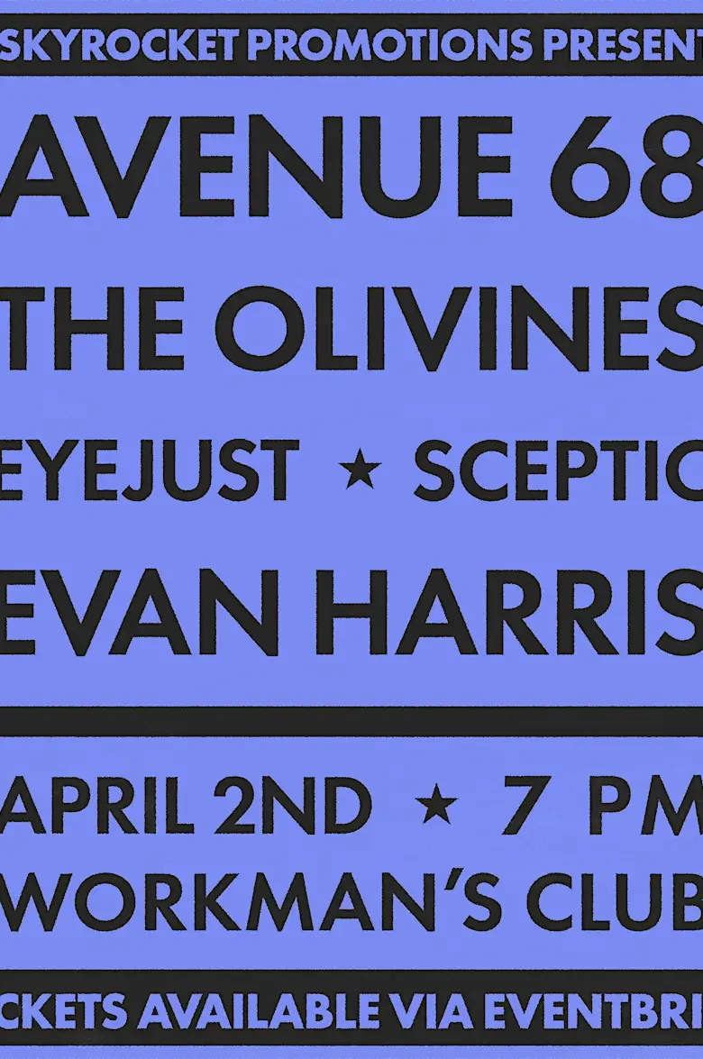 Skyrocket Promotions are proud to present Avenue 68, Sceptic, The Olivines, Eyejust, Evan Harris on April 2nd at Workmans Club.